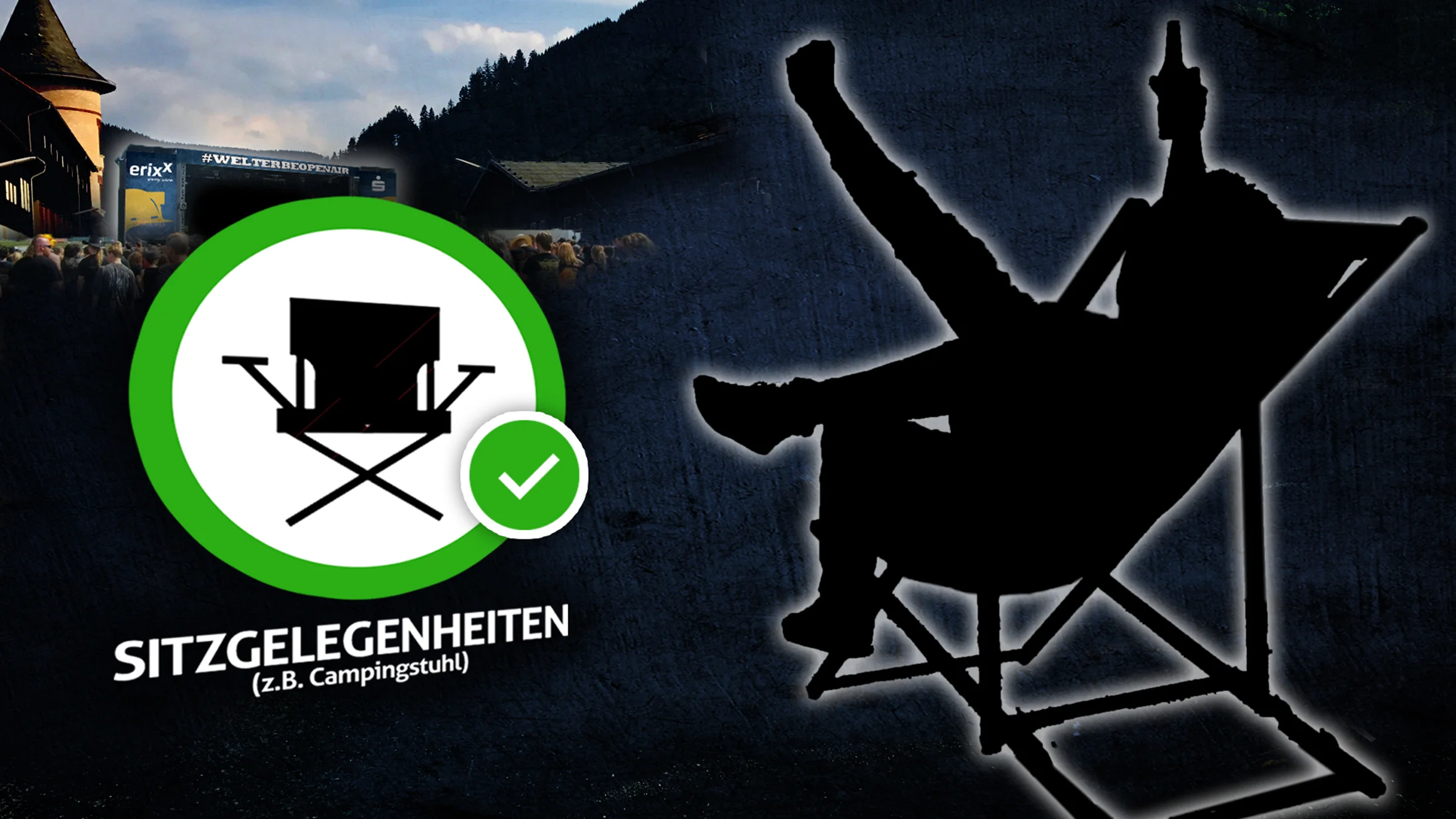 Da wir beim Welterbeopenair absichtlich auf einen Campingplatz verzichtet haben, dürft und sollt ihr eure Campingstühle mitbringen. So erlebt ihr den ganzen Tag Campingfeeling vor der Bühne und könnt mit uns die Sonne und die Musik genießen. Klar ist natürlich, dass die Stühle nicht in den ersten Reihen stehen könne/dürfen und alle Bergleute gegenseitig auf sich aufpassen.